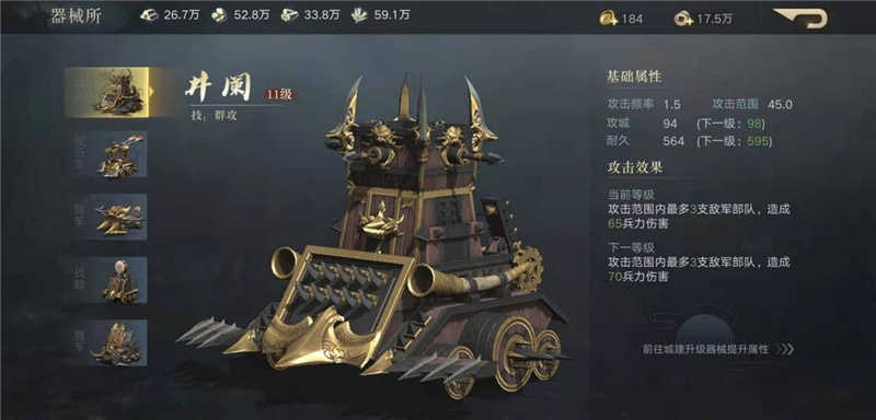 主城得建设和主线任务息息相关,升本是前期主要的任务升本也就是升级主城的意思哈,主城的作用是放开一些特定的建筑还会增加1点统御,6本和8本是俩个分水岭,6本会开放器械功能,器械里的井阑是前期非常需要的输出点,前期器械就升他,会提高队伍很强的战斗!