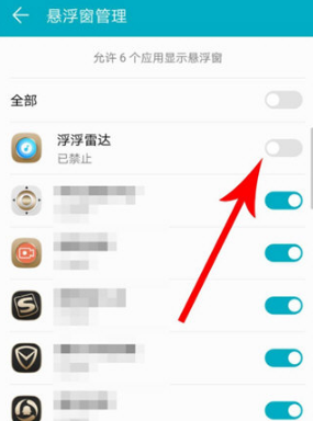 2、在“权限管理”界面点击“权限”选项,打开“悬浮窗管理”页面,并找到浮浮雷达APP,点击其右侧的锁定按钮,开启浮浮雷达的悬浮窗功能。