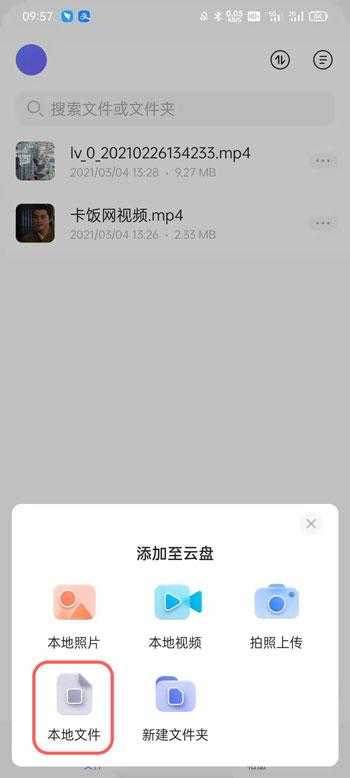 2、选择【本地文件】,将本地文件上传到阿里云盘;