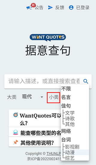 2、在搜索框中输入需要描述的意思,对“大类”以及其下分的“小类”类型做好选择后,点击搜索即可。