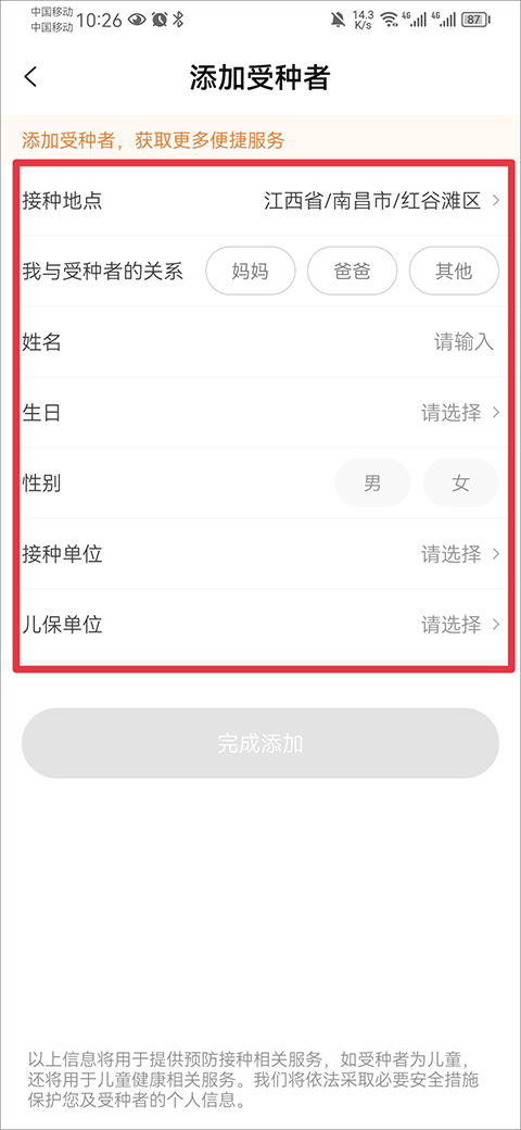 2、然后将宝宝资料信息填写完成后,点击完成添加即可