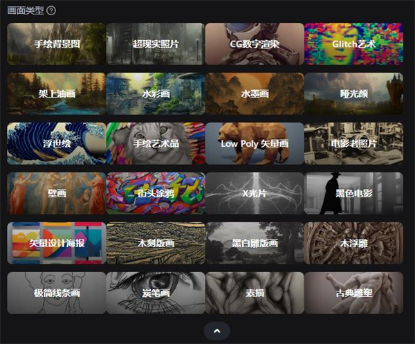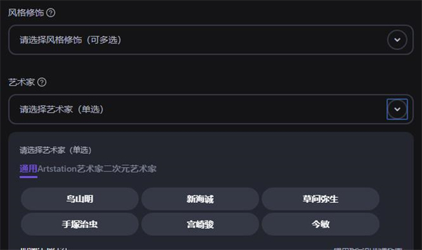 无界 AI 艺术平台也在操作界面提供了很多专业提示——【画面类型+高级设置】,对于刚接触 AI 艺术创作的用户可以先从平台指引的开始(请大胆组合它们,注意:平台仅仅是罗列了一些主流用词和艺术家,用户完全可以根据自己的认知大胆在文本描述框中写下自己喜欢的艺术家风格和各种细节修饰词),然后逐步自我拓宽自己的艺术认知和修养。