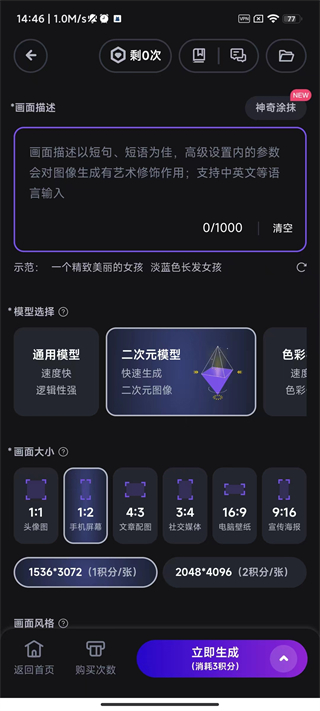 首先进入「无界版图」主页,点击「AI 创作」,在「画面描述框」内,输入想要呈现的画面内容,要特别注意的是!