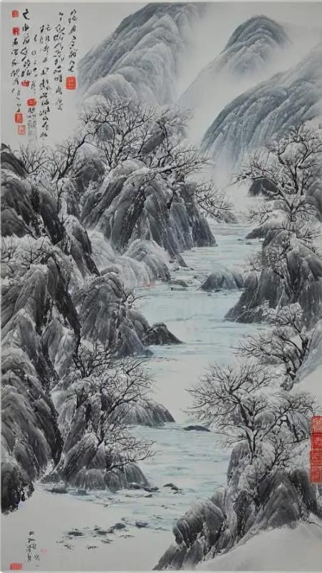 its torrent dashes down three thousand feet from high ; as if the silver river fell from azure sky,cinematic landscape, on a snowy day, natural light, ink painting, traditional chinese painting, by xu beihong