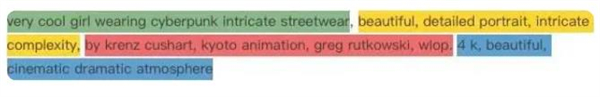 黄色部分是对人物主体的进一步修饰,以便 AI 能读懂人类希望绘制出的是一个漂亮写实的女性;
