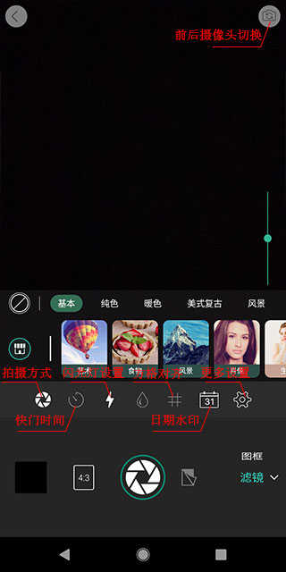 4、正下方第一栏照片添加各种滤镜以及效果,点击右下方滤镜可切换相框以及滤镜功能,右上方可切换前置摄像头,更多功能介绍可以看下图了解