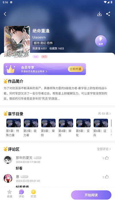 点击进入漫画详情页面,可以看到漫画的封面、简介和章节列表。