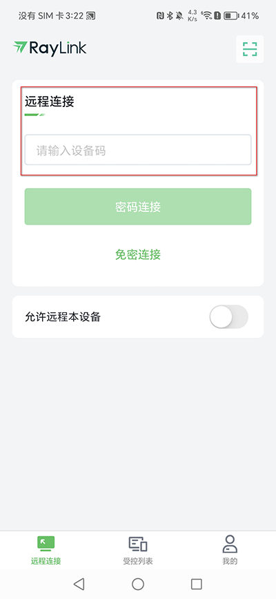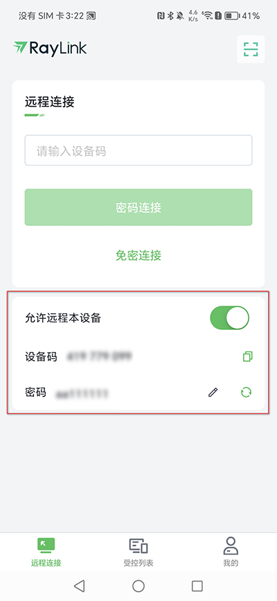 1、受控端手机安装登录RayLink远程控制软件后,开启【允许远程本设备】,开通以下2个权限