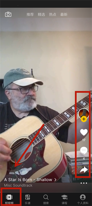 2、进入应用后默认为短视频页面,在此页面可以查看到其他用户发表的弹奏视频,你可以点赞、分享以及在评论区与其他用户交流