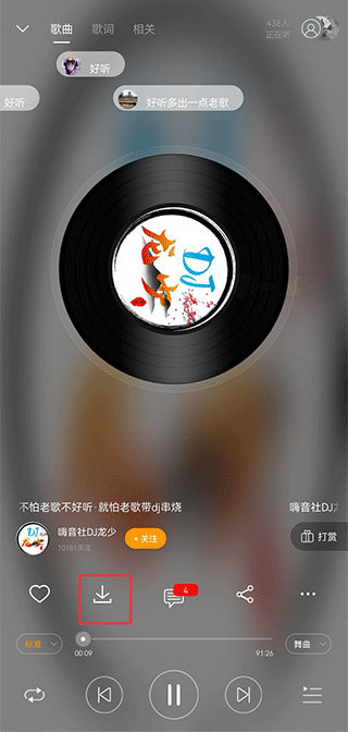 1、在播放歌曲界面中点击下载键即可下载。