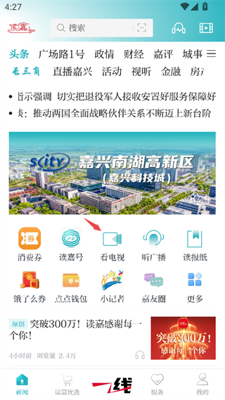 1、打开读嘉app,在首页找到看电视;
