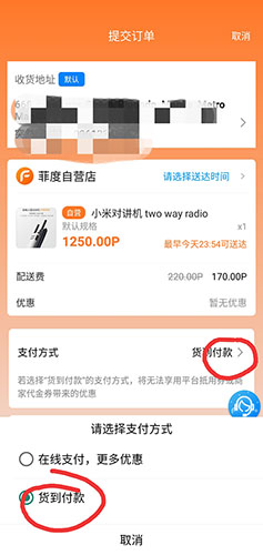 2. 您在提交订单后,即可在支付方式一栏选择货到付款(若不能选择,则为该商户暂不支持货到付款)。如对操作由任何疑问,可与我们24小时在线客服取得联系。