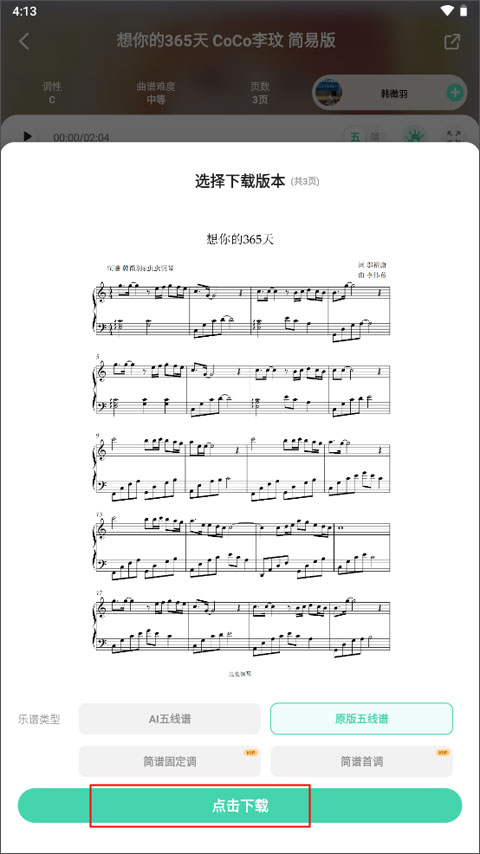3、选择乐谱的类型,最后点击下载即可将铺子获取成功。