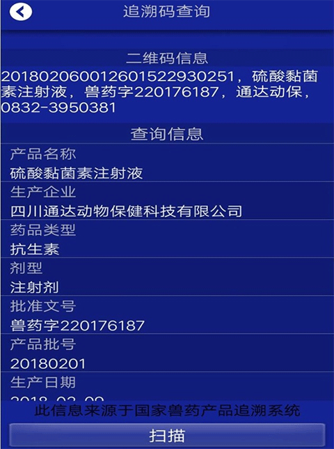 3、让整个兽药使用环节得到了严格的管控,养殖老百姓,可以通过简单的操作,直接将此软件下载下来,轻轻的扫描一下,既可以知晓兽药的真假,可谓好用有好使,所以说,国家兽药二维码,养殖保障全靠他,国家兽药二维码,动动手指辨真假!