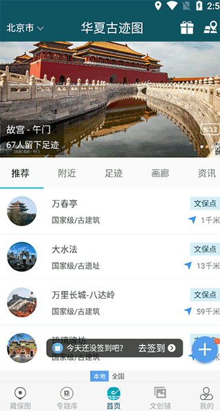 1、首先我们下载安装好app后可以看到一些文保点,一些国家建筑,距离,内容。