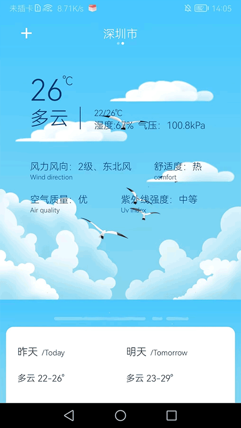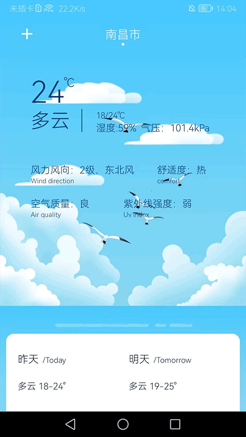 6、在天气预报页面滑动屏幕,即可查看查看自己所在城市的天气状况了。