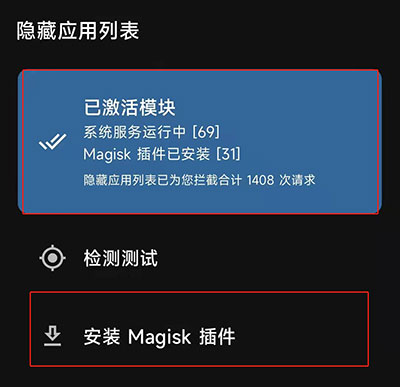 Tip:最新版隐藏应用列表app,需要在面具里移除原来旧的插件,然后在APP里安装新插件,如果插件在APP里安装失败重启无效等,请单独安装插件(统一都是面具刷入)Riru版→点我下载→Zygisk版→点我下载。