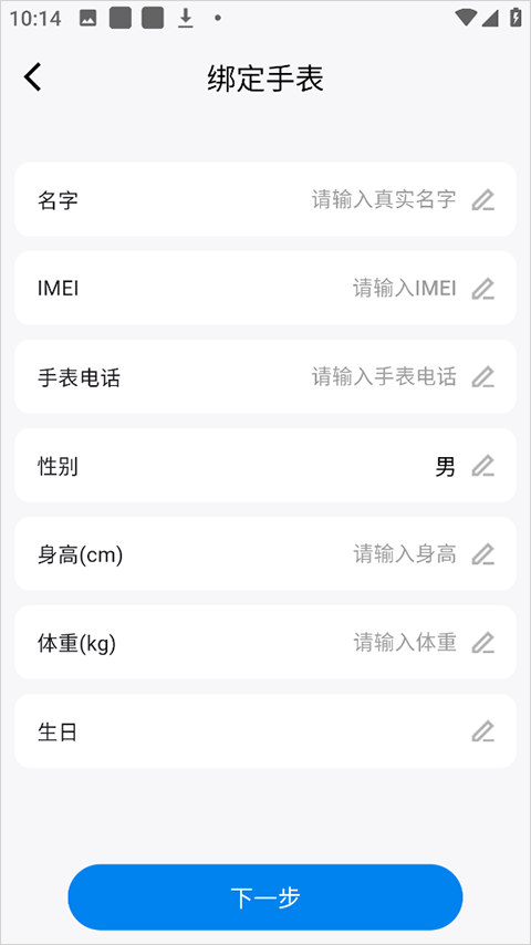 5、或者点击app中的【手动添加IMEI】输入手表说明书上或手表上的IMEI,以及其它信息进行绑定即可