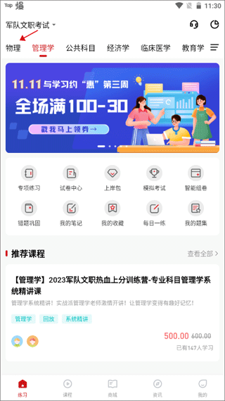 1、用手机号和验证码注册登录账号,进入到软件主页面【练习】模块,你先观察页面上排在第一位的科目是哪一个:管理学,了解了之后点击点击右边红色箭头指向的位置。