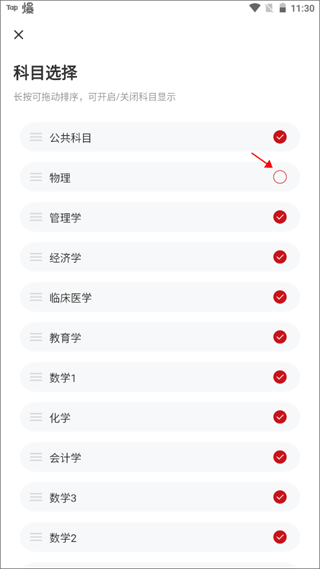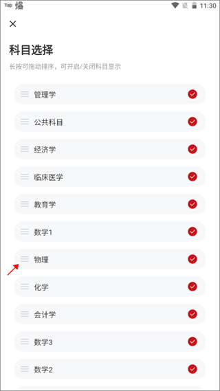 2、用手指长按其中一个科目,将它排到第一位后松手。