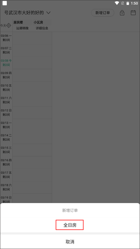 2、页面弹出一个下拉“全日房”,选择好就需要填写客人信息、新增入住人、新增预定等信息,最后点击提交订单即可。