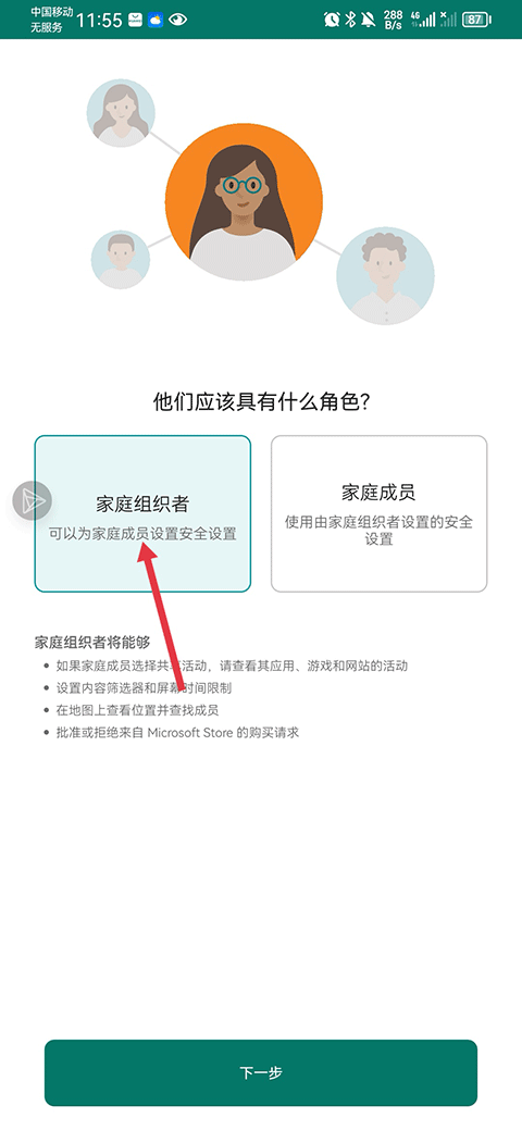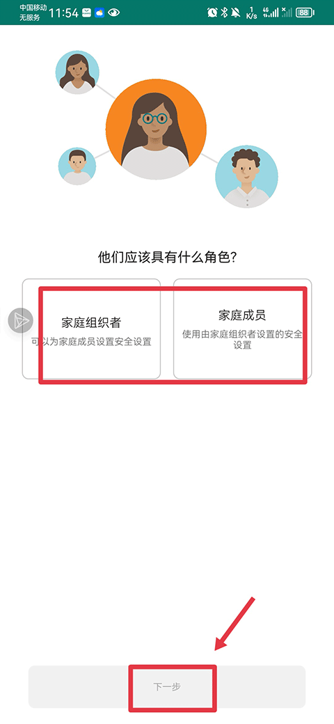 1、在添加家庭成员界面中将组织者的邮箱或电话号码输入,并点击下一步