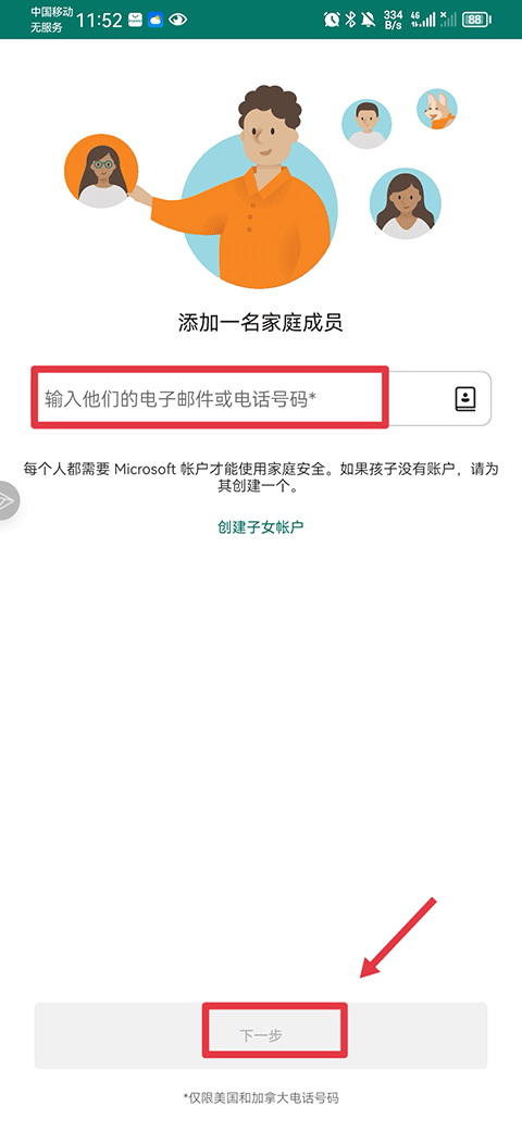 2、然后再框内输入他们的电子邮箱和电话号码,若孩子没有账户,可以点击下方创建子女账户