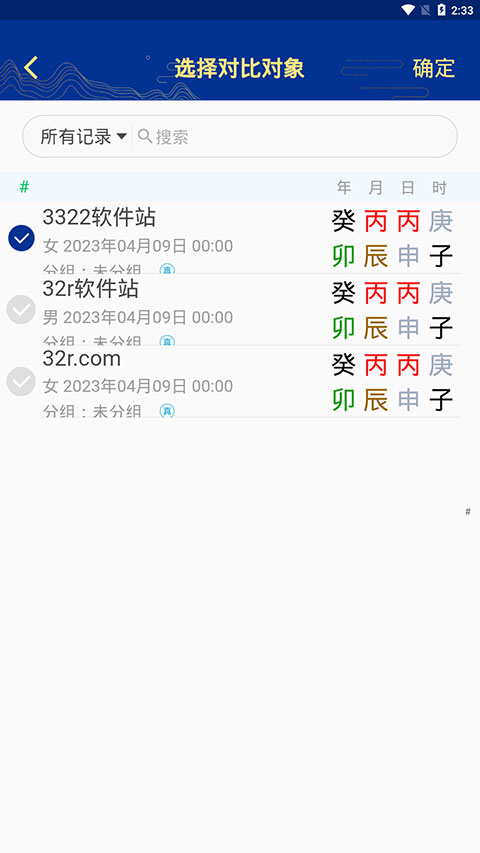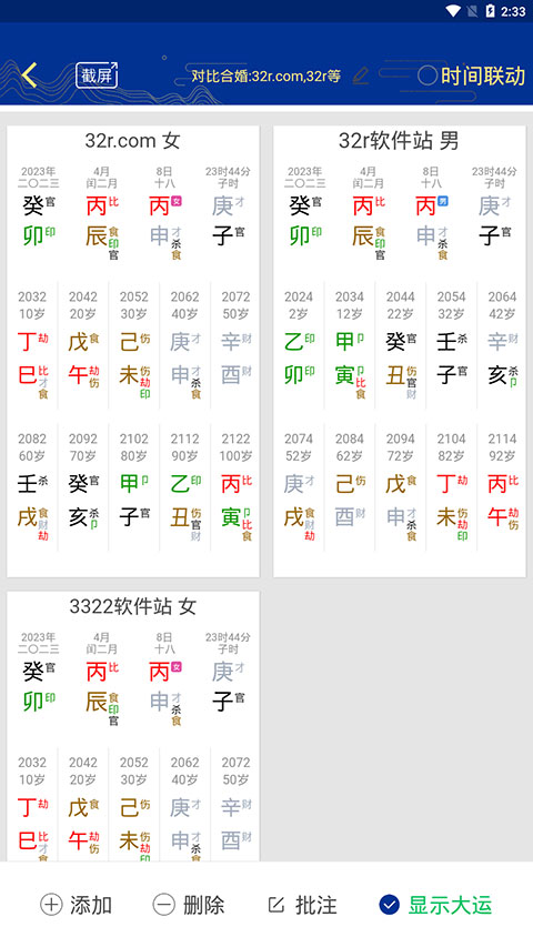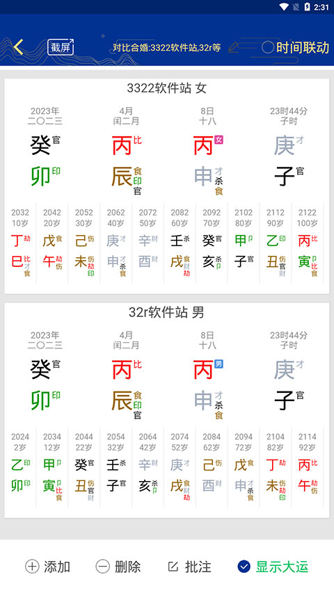 8、然后你就可以同时看到不同八字之间的【多个对比结果】了。