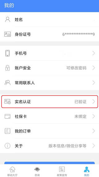 实名注册完成后用户就可以进入到应用的【我的】页面中查看到【实名认证】已验证通过了,如下图所示,这样就完成了实名认证流程了