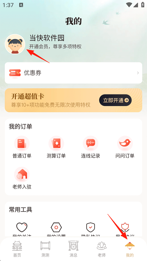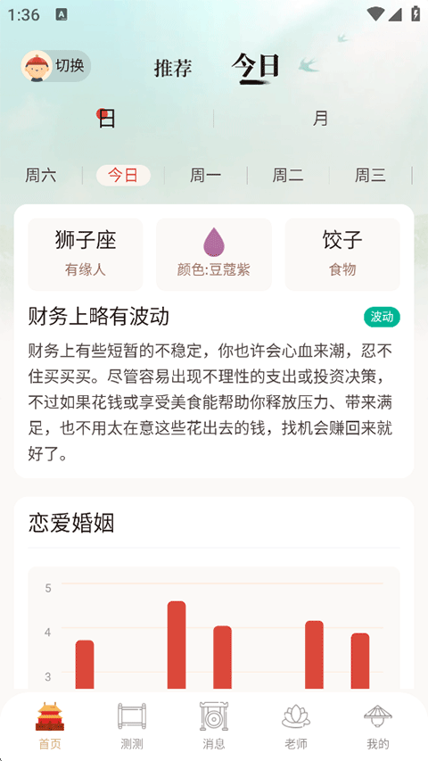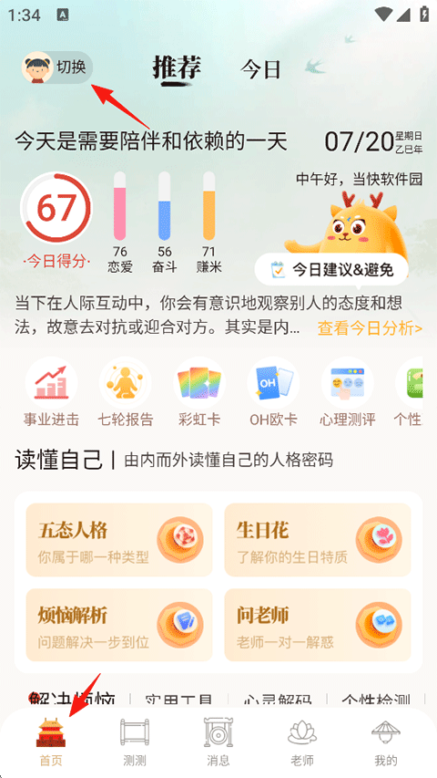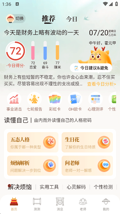 5、接着就可以在首页的推荐页查看您的个人运势和一些其他命运测试工具了;