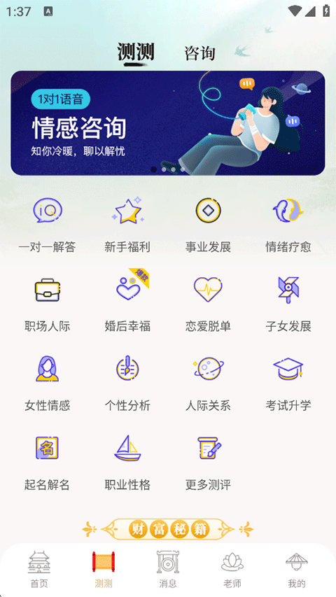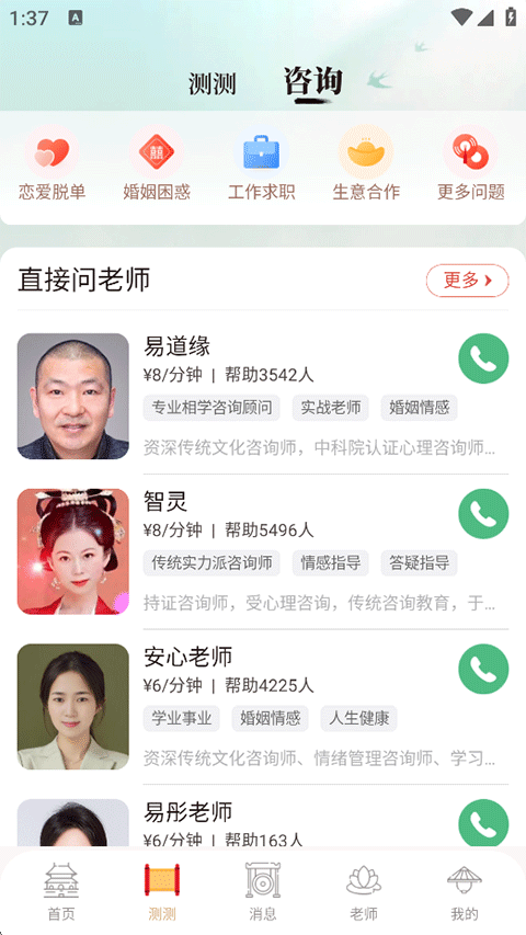 灵机是一款融合国学智慧与现代科技的命理分析工具,专注于为用户提供精准的运势预测与人生指导。该软件整合八字算命、星座测算、流年运程分析等核心功能,结合易学规律与大数据算法,以90%的准确率为用户解析性格、事业、健康及婚恋趋势。汇集了海量专业的情感咨询师,这些咨询师们根据不同的擅长领域进行划分,可以从分类栏目中找到适合自己的咨询项目,然后就能看到该栏目下清晰的咨询师列表,支持从这些咨询师中找到适合自己的咨询师并在线咨询。