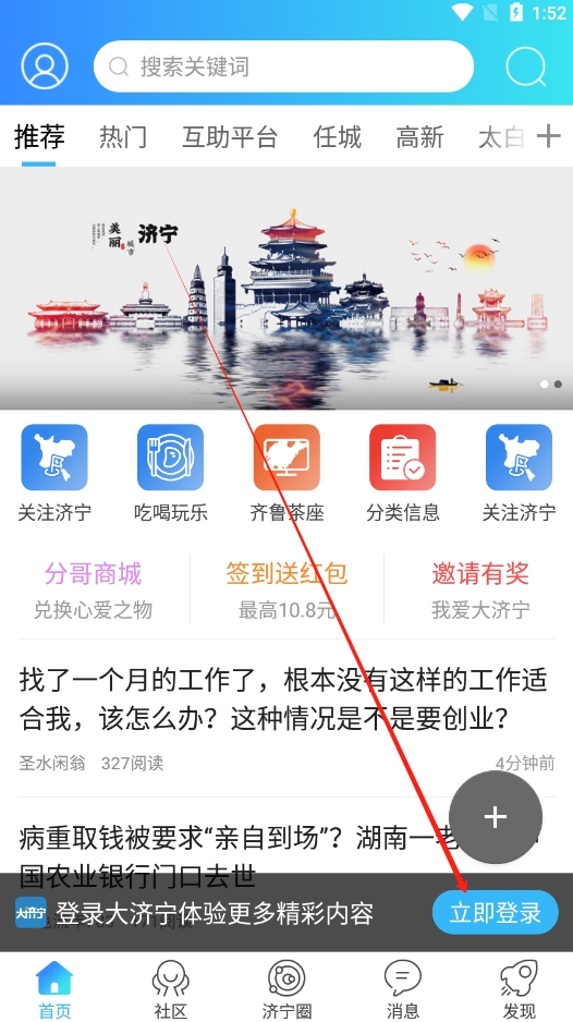 1、打开大济宁App,登录之后,点击【发现】