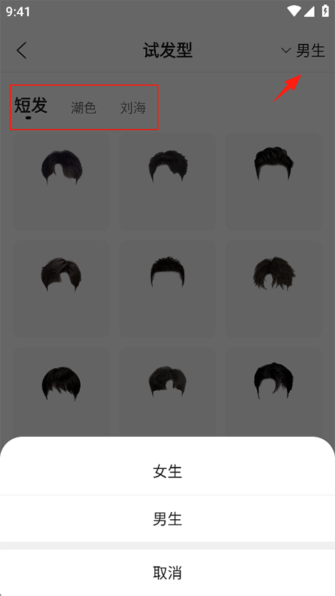 2、在右上角点击切换男生/女生性别,下方选择发型类别;