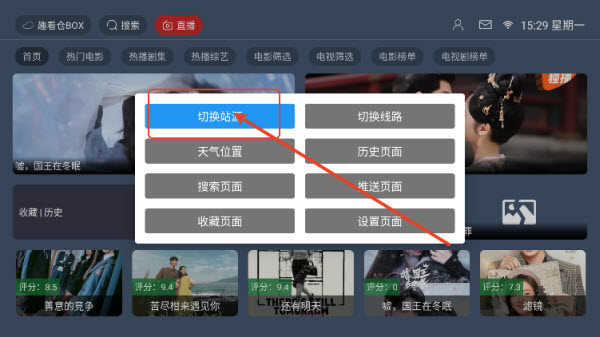 2、在页面会出现功能弹窗,选择【切换站源】;