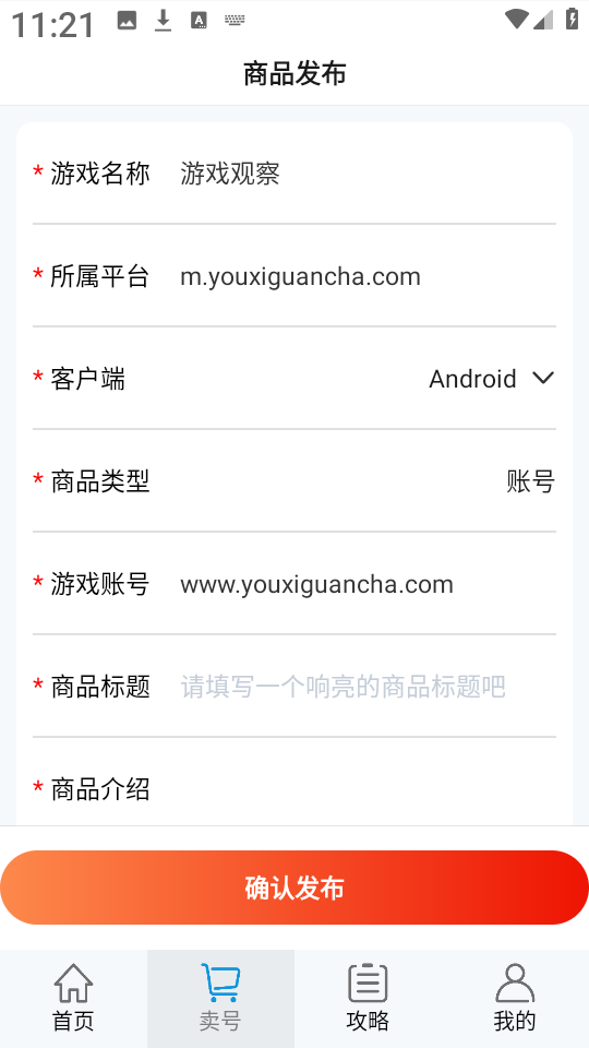 2、接着自定义按照步骤,依次填写游戏名称,所属平台,商品类型,商品标题,商品介绍等。