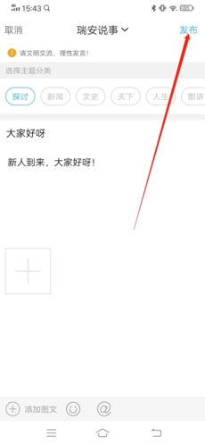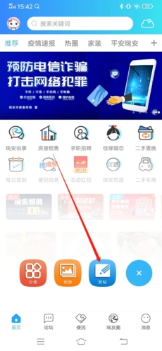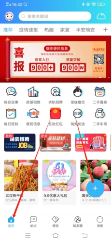 1、首先打开瑞安论坛APP,进入软件之后点击页面右下角的+号按钮,点击发帖选项