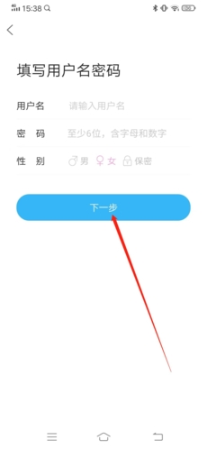 4、填入用户、密码以及设置好性别,点击“下一步”;