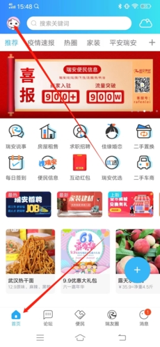 1、进入APP后,首先点击左下角“首页”,再点击左上方的“头像”;