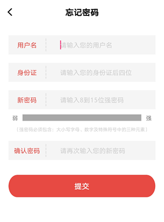 (2)党员自己在手机端登录页点击“忘记密码”功能,根据系统提示输入用户名,身份证后四位,新密码和确认密码,点击“提交”按钮重新设置密码。