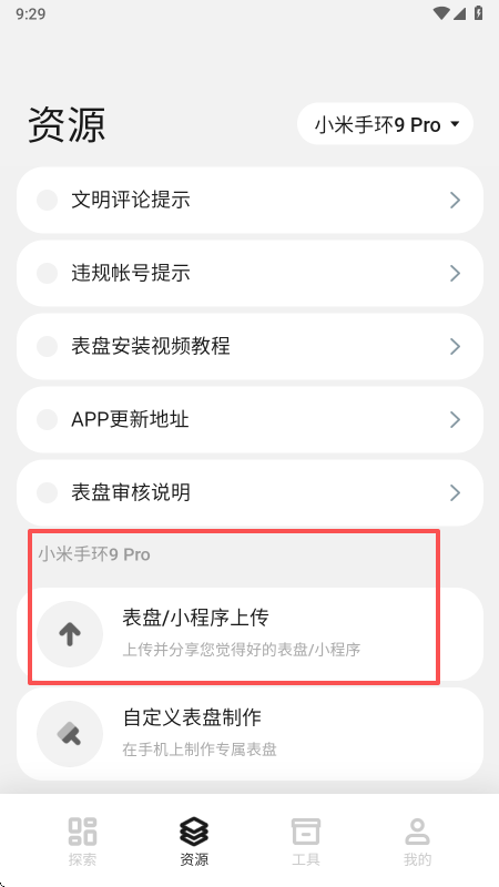 2、然后选择找到表盘/小程序上传功能,点击上传即可