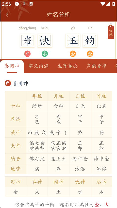 4、点击进入名字详情页,还能查看名字的五行寓意、文化内涵与吉祥程度,帮助你更全面地了解每个名字背后的意义。