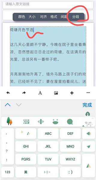 如果想要把一个文字组件里面的内容分成两个文字组件,手指点击定位文字光标,然后再点工具条上的“分段”,一个文字组件就会变成两个文字组件了。