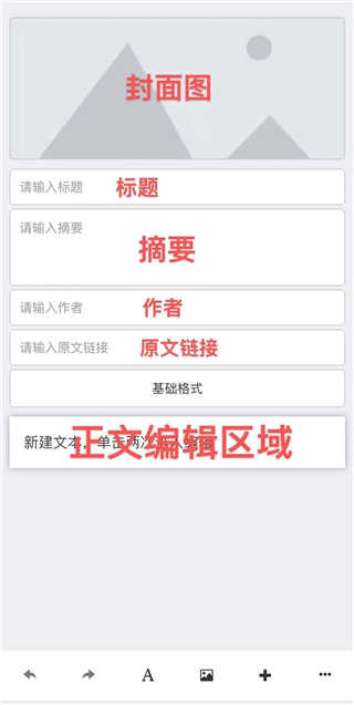 点击“新建图文”之后,会直接进入图文编辑页面,从上往下依次可以设置:封面图、标题、摘要、作者、原文链接、基础格式、正文编辑区域。