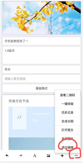 所有内容编辑完成之后,点编辑页面右下角的“···”里面的“退出编辑”即可回到我的秀米页面。