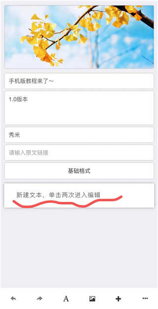 此外,当没有选中正文编辑区域里任何组件时,点击编辑页面底部的“A”图标,可以添加空白的文字组件在正文编辑区域的后面。