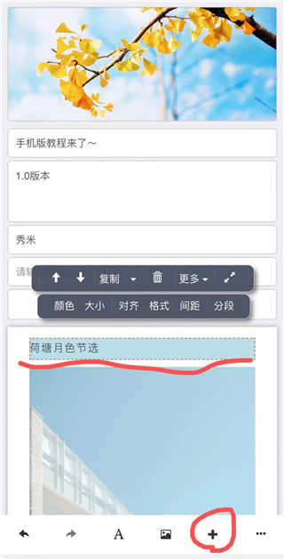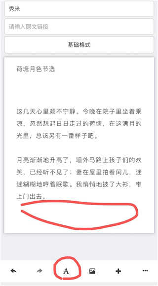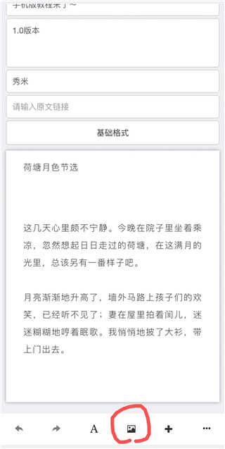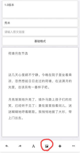 点击编辑页面底部的图片图标,可以从秀米图库或者是手机相册里添加图片到编辑区域里。