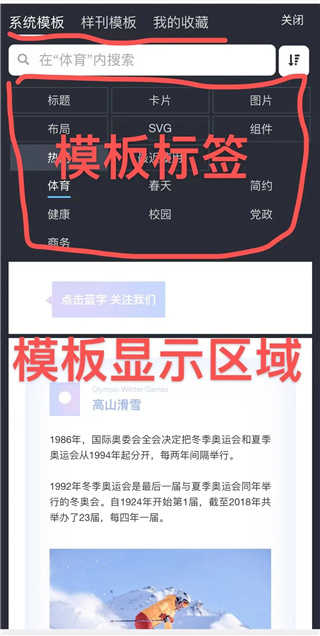 点击编辑页面底部的“+”号可以打开秀米系统模板库以及样刊模板和自己收藏的模板。