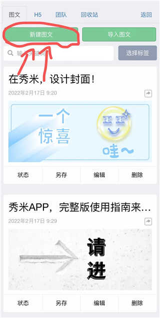 在APP上的所有点击操作都是可以用手指来完成,用手指直接点封面图的位置,会弹出秀米图库,然后点击图库里的图片即可设置封面图。