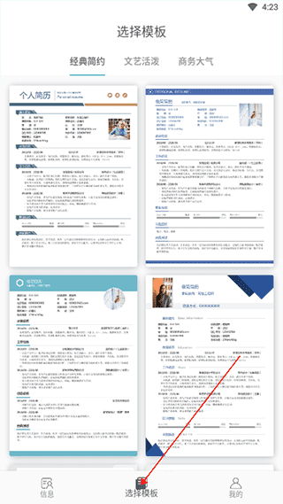 2、填好信息后,切换到选择模版页面,选择喜欢的模板,点击即可。找到简历阅览中的分享/下载按钮,即可分享、下载、保存到相册。
