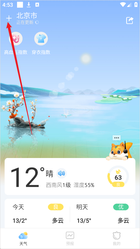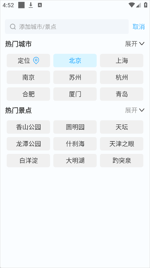 3、输入或选择想要关注的城市名称,确认后即可在首页查看该城市的实时天气信息。